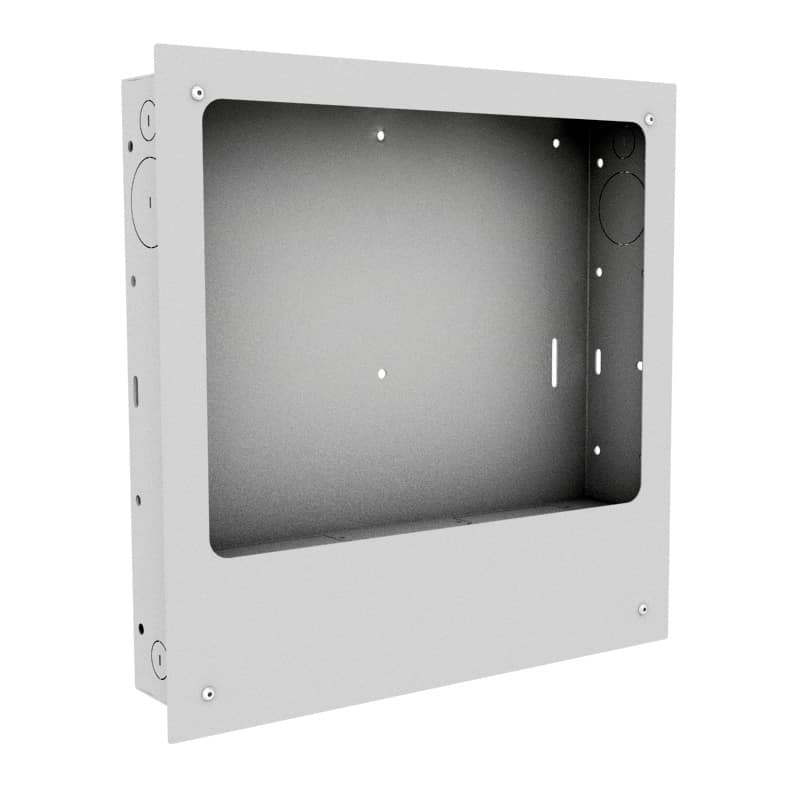 This product allows the installer to easily conceal up to 2 mains power outlets within the wall cavity between two wall studs at 16″ centres. At just 2.85″ total depth, the product is suitable for installation with wooden or steel studwork structures. Excess cables or small baluns may be concealed within the enclosure if the in-wall box is being covered by a TV screen. Customised enclosure sizes, features and finishes are available on request